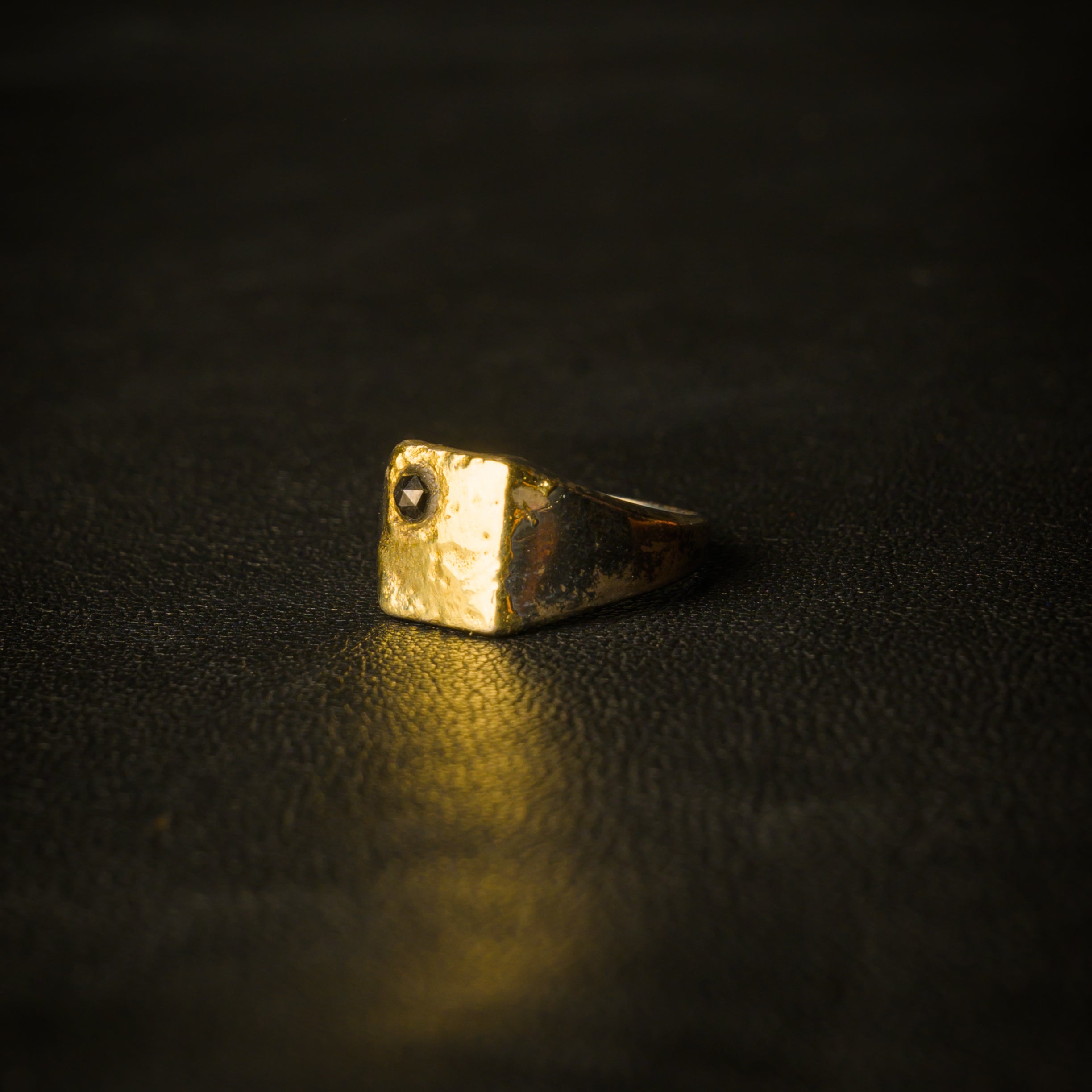 The "Aurora" Mini ring is meticulously handcrafted from 925 sterling silver, featuring an 18k gold front and a bold black diamond. Each ring is made to order by artisans in the South of France, offering a unique and elegant design.